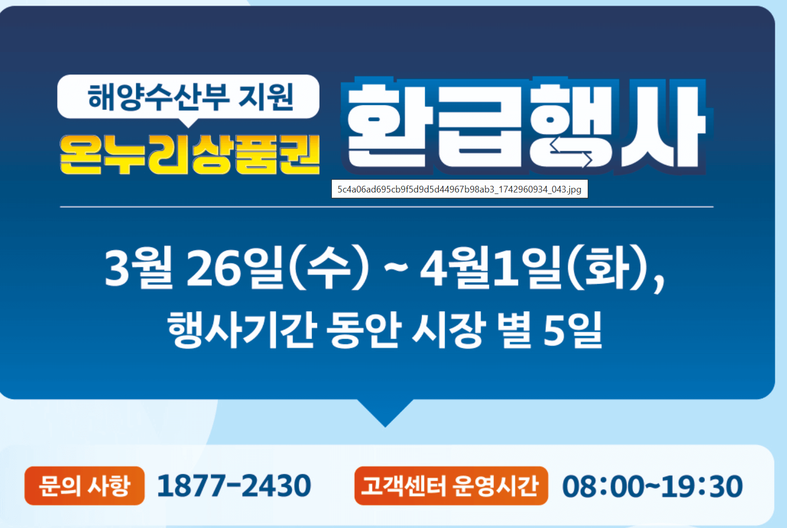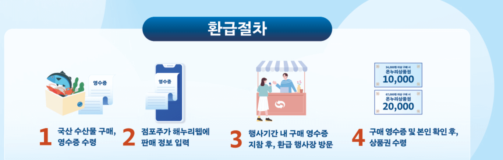 구매영수증과 신분증 휴대폰을 가지고 수산시장 내에 환급 부스로 가서 상품권을 받으세요.